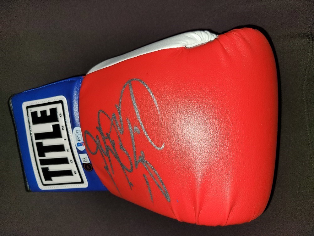 Deontay Wilder is AKA the Bronze Bomber. Take home this amazing Deontay Wilder's signed boxing glove. This striking red, white and blue autographed Deontay Wilder boxing glove is a sensational item. The limited-edition glove is signed in silver marker. Having held the WBC heavyweight champion belt from 2015 until 2020, Deontay was crowned World Champion. The American boxer got his nickname after being awarded a bronze medal in the 2008 Olympics. Additionally, the legend has knocked out every opponent he has defeated. An unforgettable heavyweight champion you don’t want to forget. This autographed Deontay Wilder boxing glove would grace and harden any boxing fans collection. This exclusive item comes with an official COA from Sports Memorabilia and Beckett. Sports Memorabilia Authentication # B220141 Beckett Authentication # F57947 Boxing glove purchased from Sports Memorabilia https://www.sportsmemorabilia.com